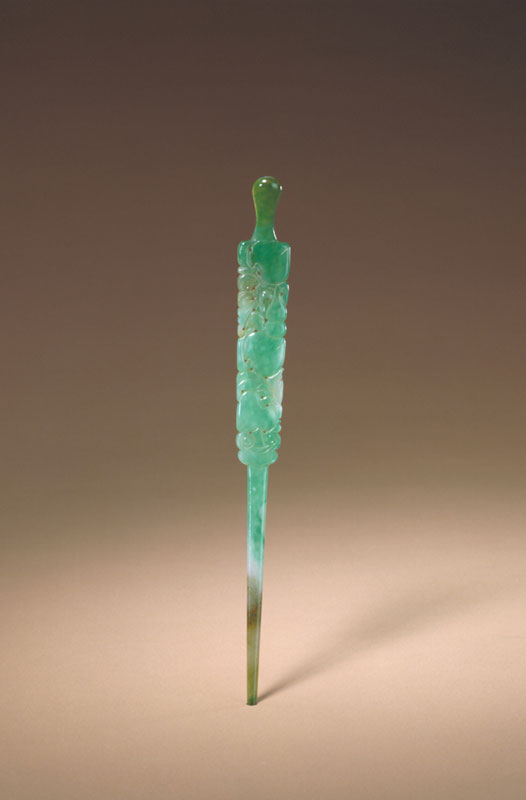 簪是古代妇女使用的头饰,用来别住发髻,亦有装饰作用。玉簪使用的历史悠久,目前发现的早期作品为隋唐时所制,随着时代的发展其形制亦有所演变。这类柄部呈片状的长簪主要流行于清代。
