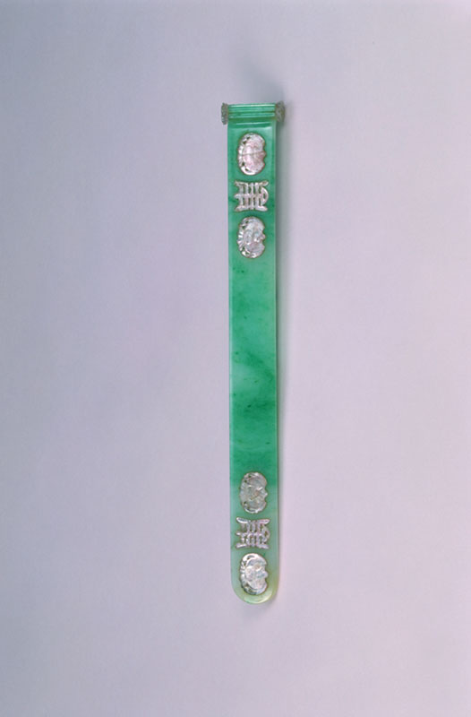 翠色青绿,局部绿色较重。扁方长条形,片状。面上两端分别粘嵌两只粉碧玺蝙蝠和一寿字。一端回卷,两个端头各嵌有碧玺花。