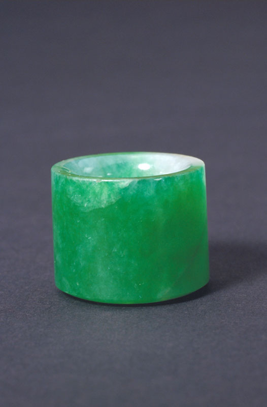 翠质为绿色。扳指呈圆筒形,一端口内呈坡状,光素无纹。