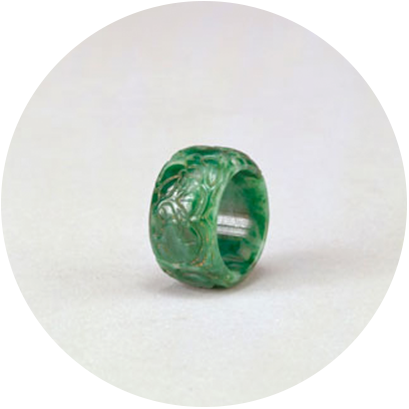 扳指是男子用于指部的饰物,古人称其为“韘”,是拉弓射箭时套于手指用以护指的物品,逐渐演化为佩饰。扳指可用多种材料制作。明代以前扳指的形制多近似于片状,孔的一侧向外延展。筒状扳指主要流行于清代,在清代皇帝的御制诗中可看到有关扳指的诗句,当时的扳指外表多有花纹及文字,而素扳指多以材质优良取胜。