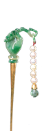 簪柄为绿色翠料,簪头翠色青白。柄部呈片状,端部细长,有勺,可用以掏耳。柄中部凸雕三桃、桃叶及葫芦一只,与簪头相接处有如意纹。簪头细长。