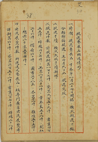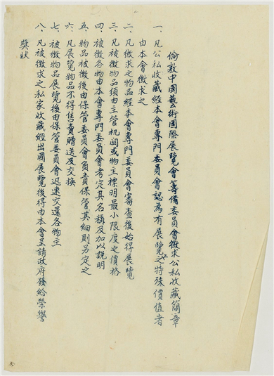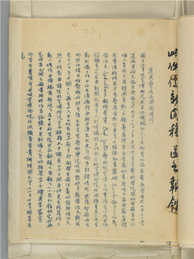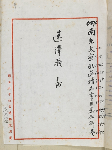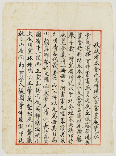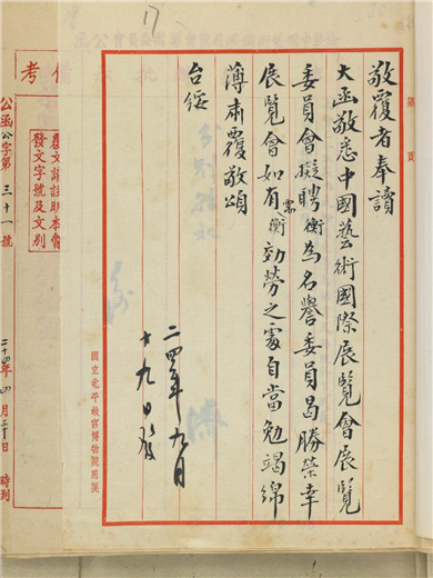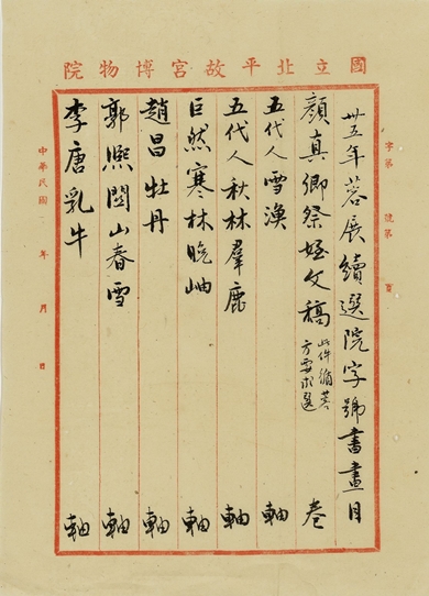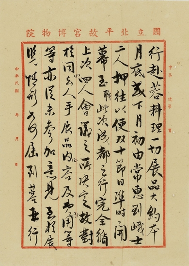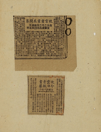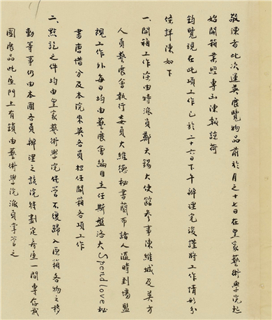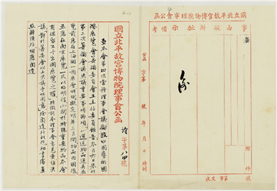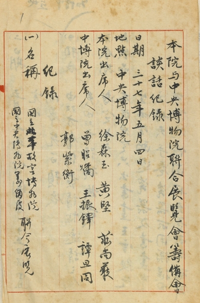 1948年5月30日—6月8日,故宫博物院与中央博物院筹备处在中央博物院筹备处陈列室举办了联合展览。展出商周青铜器、汉代文物、历代帝后像等文物。故宫博物院精选唐至清代书画大家的立轴、册页102件,宋至清代历朝瓷器名品80件,铜器散盘1件,共183件参展。蒋介石、蒋经国、于右任等政要名流出席参观,盛况空前。
