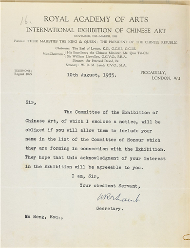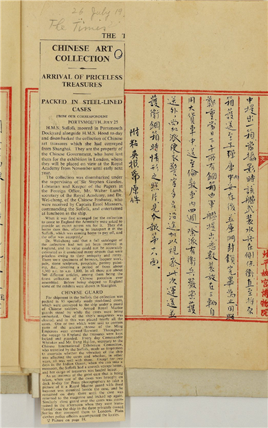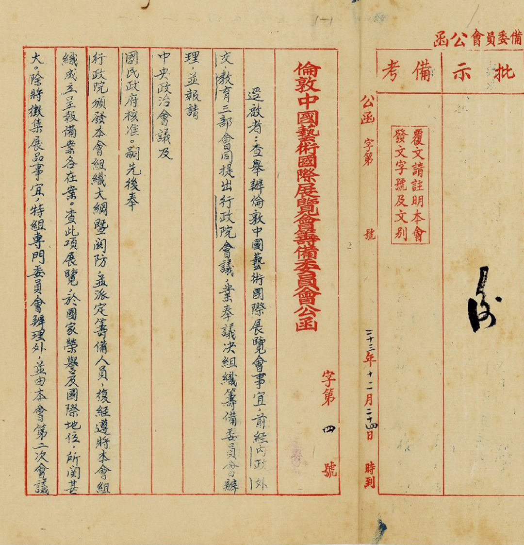 1935年7月28日至1936年3月7日,在英国伦敦皇家艺术学院举办了中国艺术国际展览会。故宫博物院在存沪的文物中提选735件文物参展,内政部北平古物陈列所、河南博物馆等单位也提选部分文物赴英参展。这是中国文物第一次以官方的途径大规模出国展出,观众十分踊跃,在欧美形成了持久的中国艺术热潮。