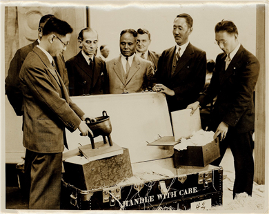 1940年应苏联政府艺术委员会的邀请,故宫南迁文物参加了在苏联举办的莫斯科“中国艺术展览会”。故宫博物院参展的文物有铜器、玉器、缂丝、书画共100件。展品全部从藏于贵州安顺华严洞的文物中挑选。文物于1939年7月18日从安顺运出,19日抵达陪都重庆,26日自重庆运出,8月7日抵达兰州,换用飞机运至迪化(今乌鲁木齐),9月4日抵达莫斯科。