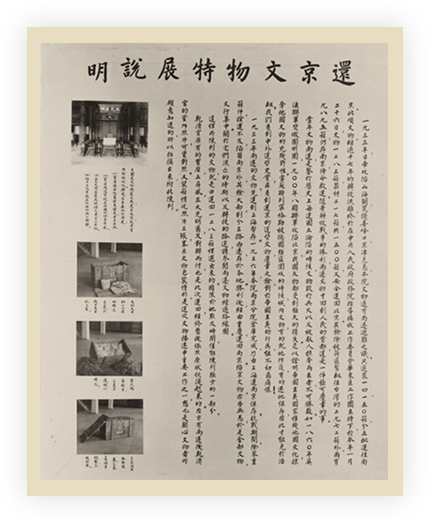 故宫文物南迁是中国文化史上一个重大的历史事件,是中华民族“文化抗战”的一个重要组成部分。故宫前辈在文物播迁之际对故宫文物的宣传、展示提振了民众的精神,增强了民族的凝聚力,坚定了抗战必胜的信念。在海外举办的中国艺术展览会加深了战时同盟国间的了解,赢得了世界上对中国抗日战争的广泛的同情,有利于取得抗日战争的最终胜利。