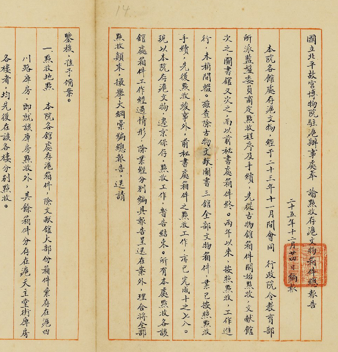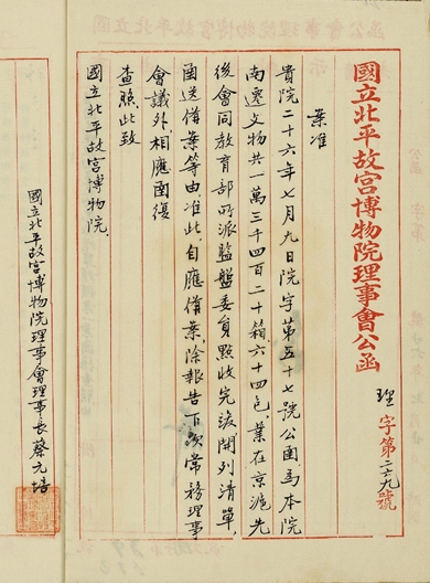 1933年易培基院长被迫辞职后,马衡先后任代理院长和院长职务。上任伊始,他立即组织开展对故宫博物院留北平文物的清点及南迁运沪文物的点收工作。七·七事变后,马衡又组织了故宫博物院“文物西迁”。抗战胜利后,主持故宫博物院文物东归南京工作。