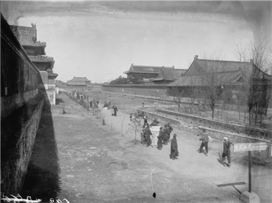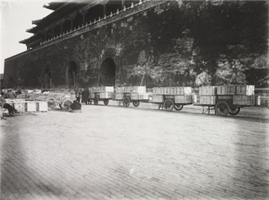 古物陈列所的箱件装上排子车,经过午门的情形
