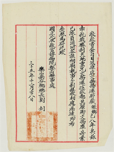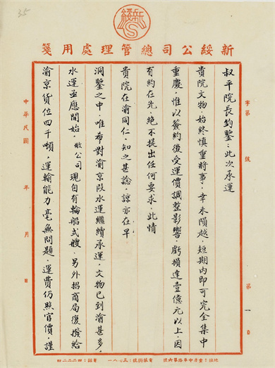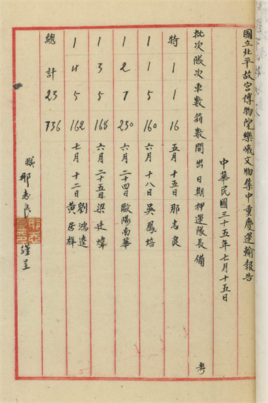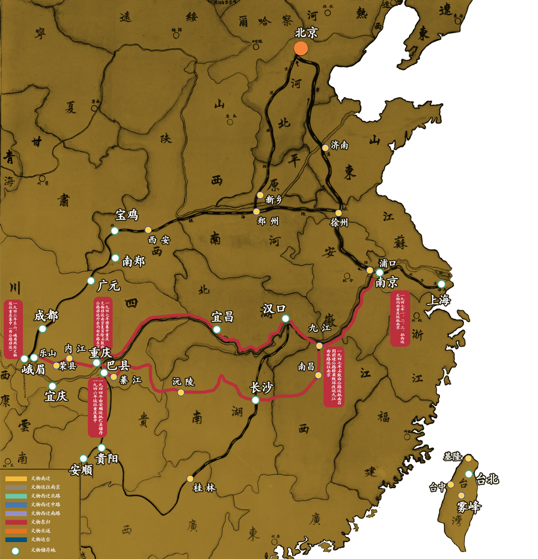 从水陆运输的文物分批由重庆出发,沿长江水陆运往南京。首批于1947年6月19日自重庆开出,末批11月26日离渝东航,至1947年12月9日东归告竣。