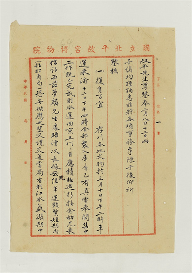 文物东运工作始于1947年5月,至12月9日结束。工作分水陆两线进行。从陆路运往南京的是14箱比较笨重的箱件,其中包括国子监石鼓10箱、石鼓文音训碑1箱和笨重杂件3箱,动用10辆汽车。陆路运输原计划是取道川、湘、赣、皖、苏公路直达南京,由于很多道路损坏、桥梁失修,结果行至南昌时改道九江从水路运输。1947年5月31日从重庆出发,7月26日到达南京。