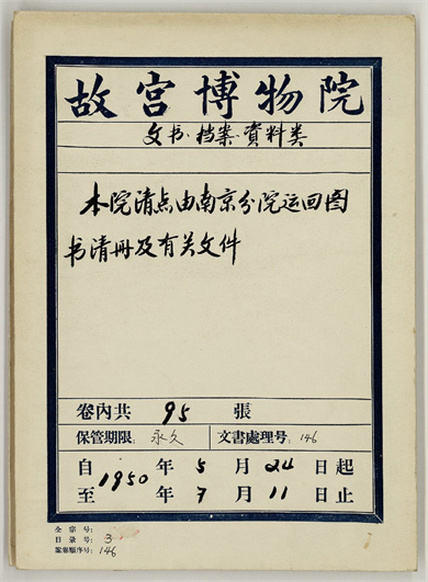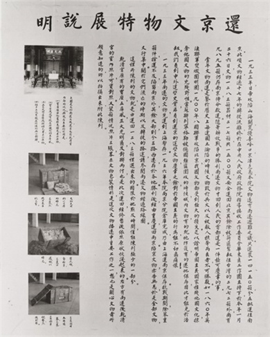 1950年,文物北运启动,当年即从南京分院分批运回南迁文物1,500箱。2月1日至3月30日,挑选北返文物150件,在故宫博物院的乾清宫首次举办了 “还京文物特展”,图为当年还京文物特展说明。