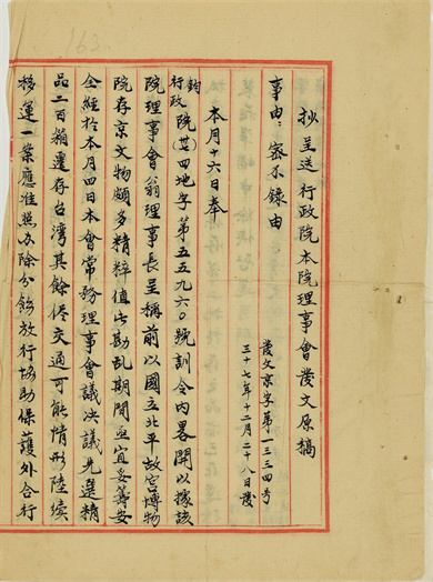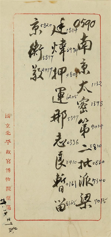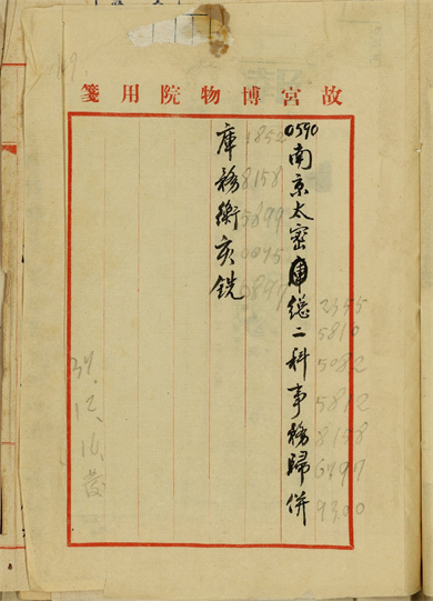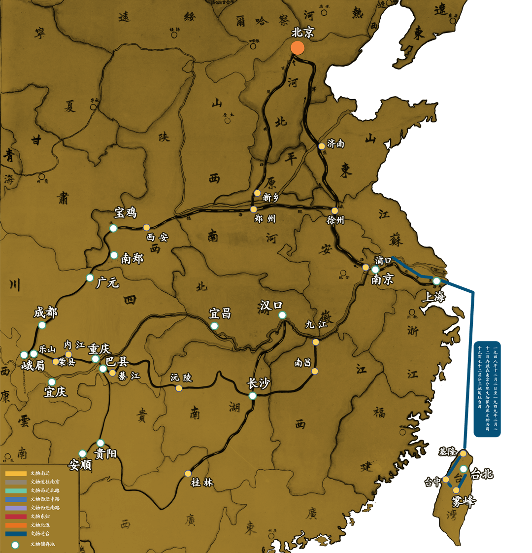 自1948年12月22日至1949年2月22日,存放在故宫博物院南京分院文物保管库的2,972箱文物分三批运往台湾。1948年12月22日至27日,第一批文物320箱由海军部“中鼎号”轮载运至台湾的基隆港,转汽车运至新竹县杨梅镇的通运公司仓库临时存放。随船押运人员:庄尚严、申若侠、刘奉璋;1949年1月6日至9日,第二批文物1,680箱由招商局商船“海沪轮”载运至台湾基隆港,转汽车运至台中糖厂仓库临时存放。随车押运人员:那志良、粱廷炜、吴玉璋、黄居祥;1949年1月29日至2月22日,第三批文物972箱由海军部“昆仑舰”载运至台湾基隆港,转汽车运往台中糖厂库房临时存放。随车押运人员:张德恒、吴凤培。1950年4月,全部运台文物搬迁至台中县雾峰乡吉峰村北沟库房。1965年,又全部运往台北市郊士林外双溪新建库房,并成立了台北故宫博物院。