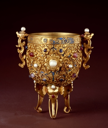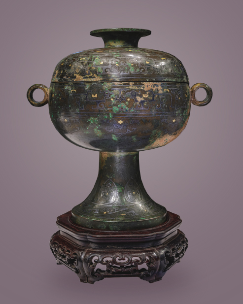原名周夔凤豆。通体错金银。覆碗状盖,圆形捉手,子母口,双环耳,喇叭形圈足,盖饰错金银三角卷云纹、夔凤纹,腹、足饰夔凤、鸱枭纹。