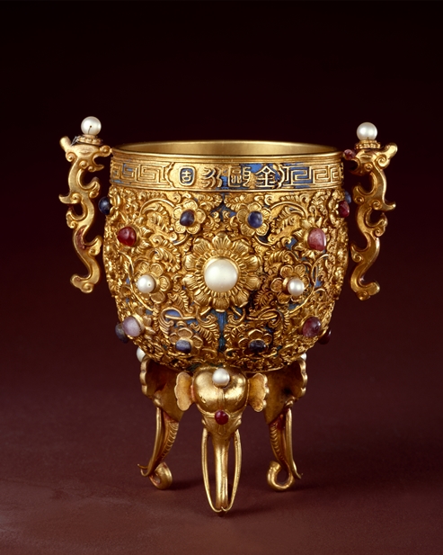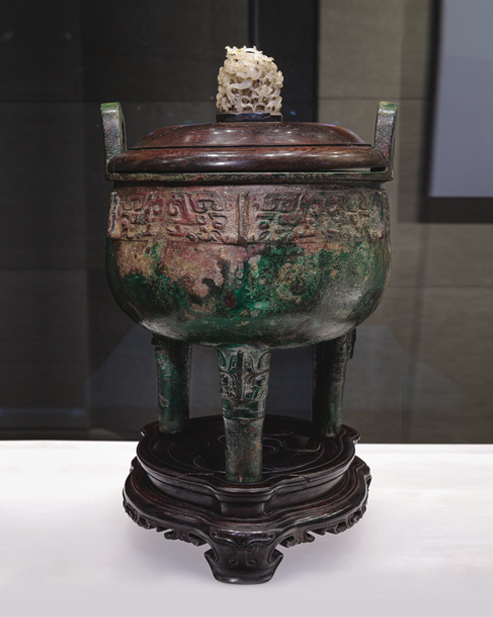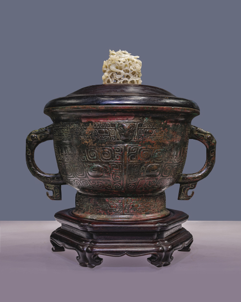 原名周饕餮甗。甑、鬲连铸,分饰云雷纹,兽面纹。清代配黄花梨盖,上嵌透雕春水玉钮,内刻“乾隆御赏”款。