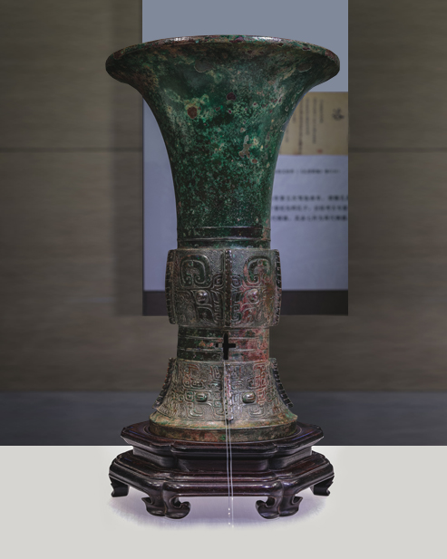 原名周亚尊。喇叭形口,长颈,腹微鼓,高圈足;腹与足均铸四道扉棱,饰兽面纹;腹下有两个“十”字镂孔;足内壁铸铭文二字“亚弓”。