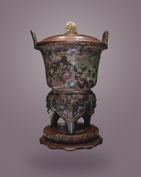 原名周伯彝。侈口,深弧腹,兽首耳,其下有珥,圈足外撇。器身通饰兽面纹,沿下前后各饰一兽首。内底铸铭文二十字,可辨七字为“伯作尊彝用……永……享。” 清代配紫檀盖,上嵌透雕龙纹玉钮,内刻“乾隆御赏”款。