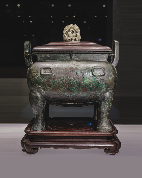 原名周四足鬲。方形,平折沿,立耳,腹微鼓,圜底,蹄形足。肩有八个凸起的矩形纹。清代配紫檀盖,上嵌透雕花鸟纹玉钮,内刻“乾隆御赏”款。